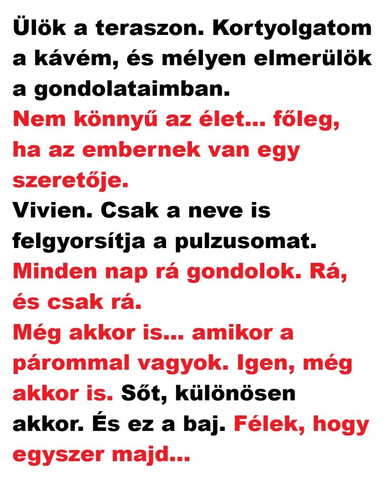 Ülök a teraszon. Kortyolgatom a kávém, és mélyen elmerülök a gondolataimban. Nem könnyű az élet… főleg, ha az embernek van egy szeretője. Vivien. Csak a neve is felgyorsítja a pulzusomat. Minden nap rá gondolok. Rá, és csak rá. Még akkor…